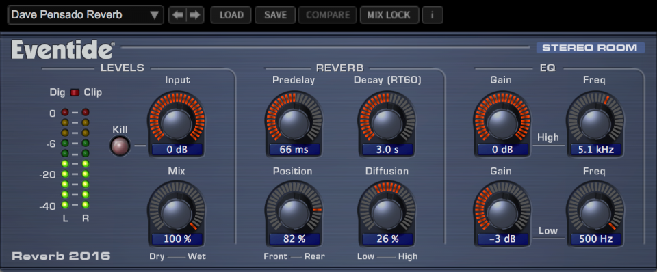 The Eventide 2016 Stereo Room Plug-In was designed to simulate the original reverb sound of the SP2016 rackmount which has been used on hit records for decades to create the subtle sound of a unique physical space, be that a dark hallway or a bright studio vocal room. This is handled using intuitive controls to fine tune the effect.