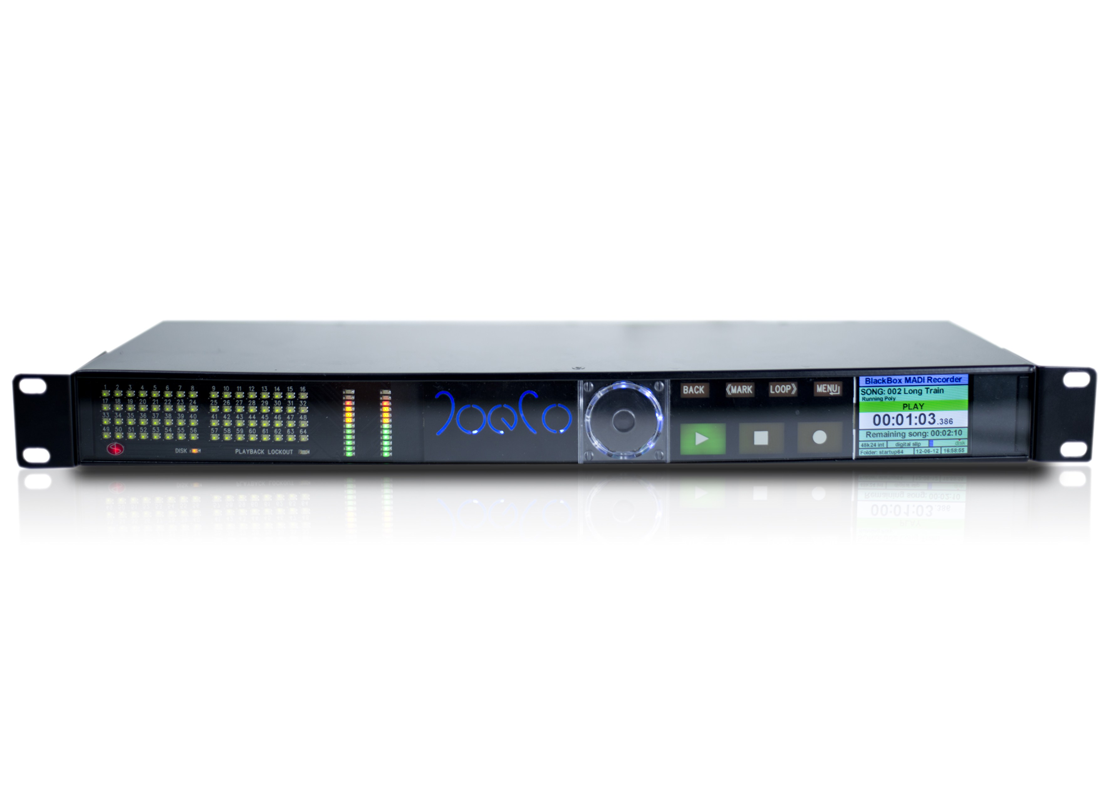Audio is recorded as mono broadcast WAV files to an external USB2 drive, or USB2 Flash drive. The implementation of JoeCo’s iXML plug- in additionally enables PolyWAV files to be recorded. Recorded files can be instantly imported into any Mac- or PC-based Digital Audio Workstation for editing, remixing and re-purposing. Simple full color screens instantly communicate all you need to know during operation and an additional software add-on turns the recorder into a BlackBox Player.