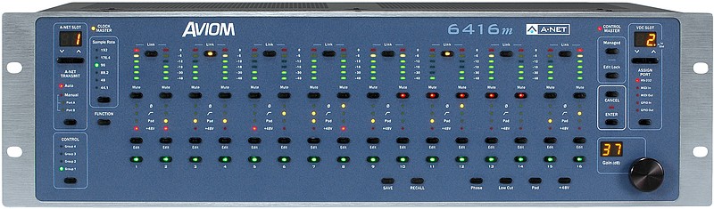 The remote-controllable 6416m Mic Input Module provides 16 state-of-the-art mic- level analog inputs to a Pro64 system. Each channel features continuous gain control, +48V phantom power, low cut filter, phase invert, mute, and a network activation button. With a switchable pad per channel, the 6416m also accepts balanced line-level inputs.