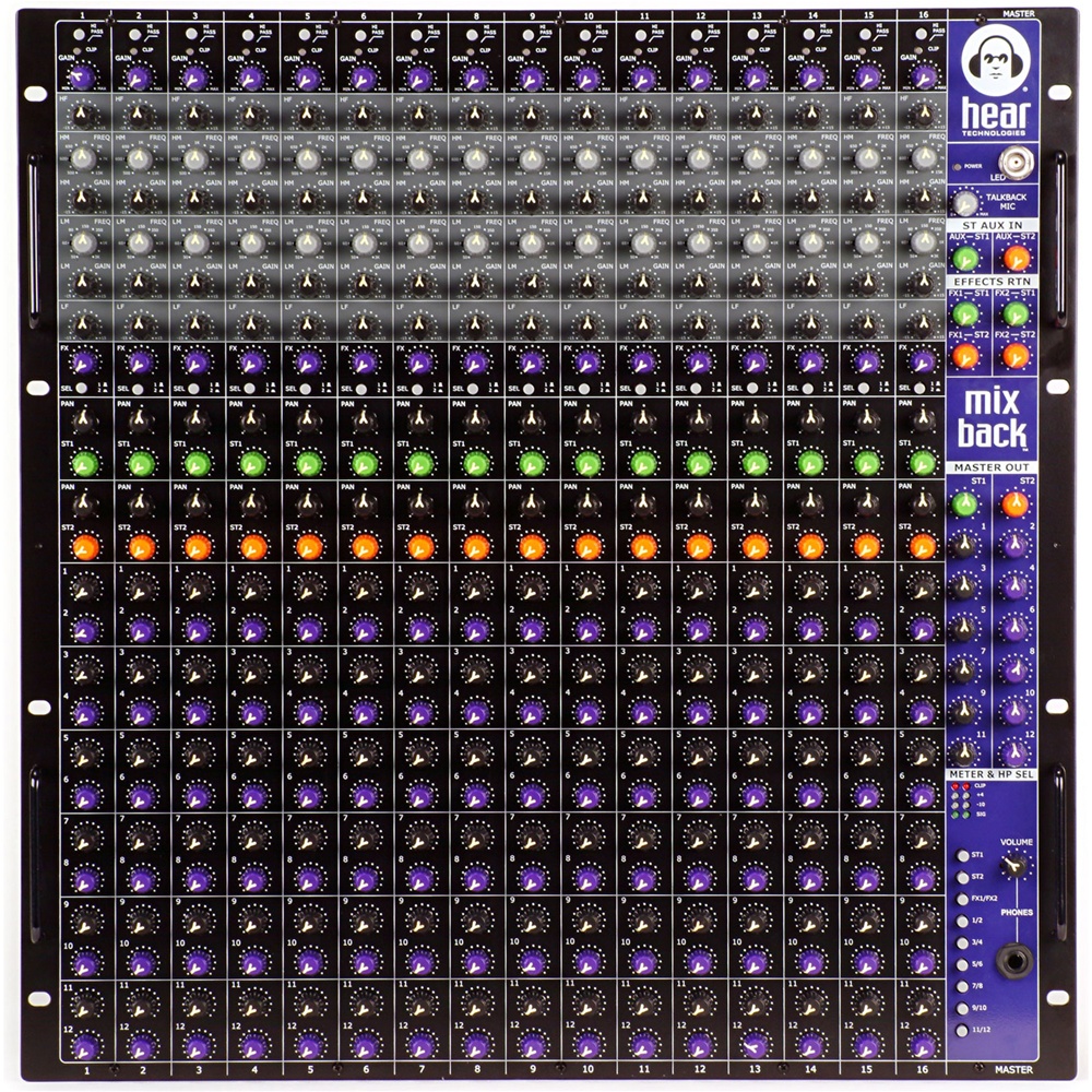 The Mix Back is a flexible and affordable 16 x 12 x 2 x 2 monitor mixer that features two stereo outputs and twelve mono outputs. There are sixteen high quality