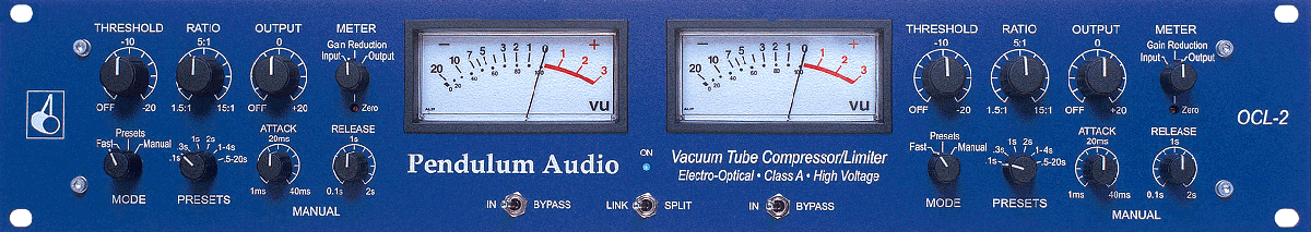 The OCL-2 is a two channel electro-optical compressor/limiter designed for the utmost in transparency, detail and versatility. Our short signal path design uses a custom optical input attenuation network in front of an all tube class A gain stage. Since the signal path is entirely transformerless, we've eliminated the coloration inherent in traditional transformer-coupled tube designs. The result is an open, detailed sound with an expanded sound stage and clarity that can only be achieved with modern tube circuitry.