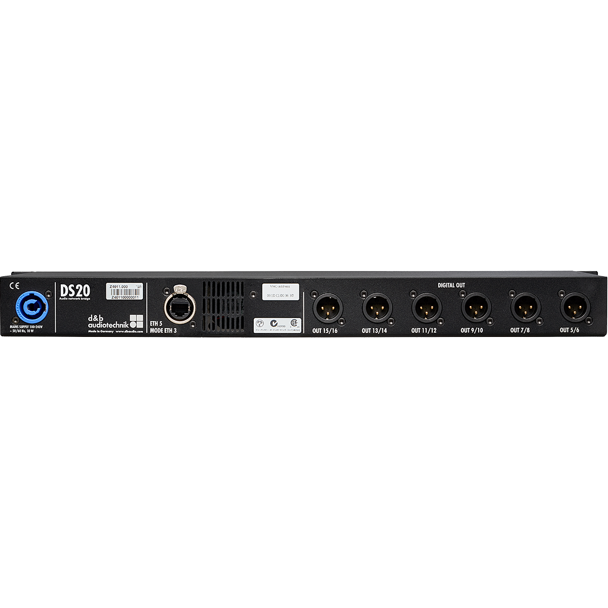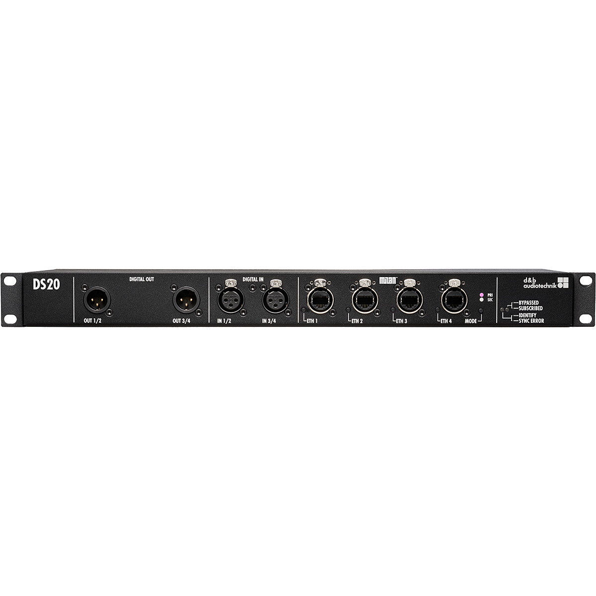 The DS20 Audio network bridge interfaces between Milan networks and AES3 digital audio signals, while also providing distribution of Ethernet control data. This 1 RU device integrates directly into the d&b system approach, positioned in front of the amplifiers within the signal chain, and is ideally suited to both mobile and installation environments. The DS20 sends metadata including Milan channel labels and cabling information via the AES3 channel stream to the d&b four channel amplifiers. As well as providing an interface from the Milan audio network to the digital inputs of the d&b amplifiers via Ethernet, the DS20 provides four digital AES3 input channels for applications such as a break in from a Front of House console.