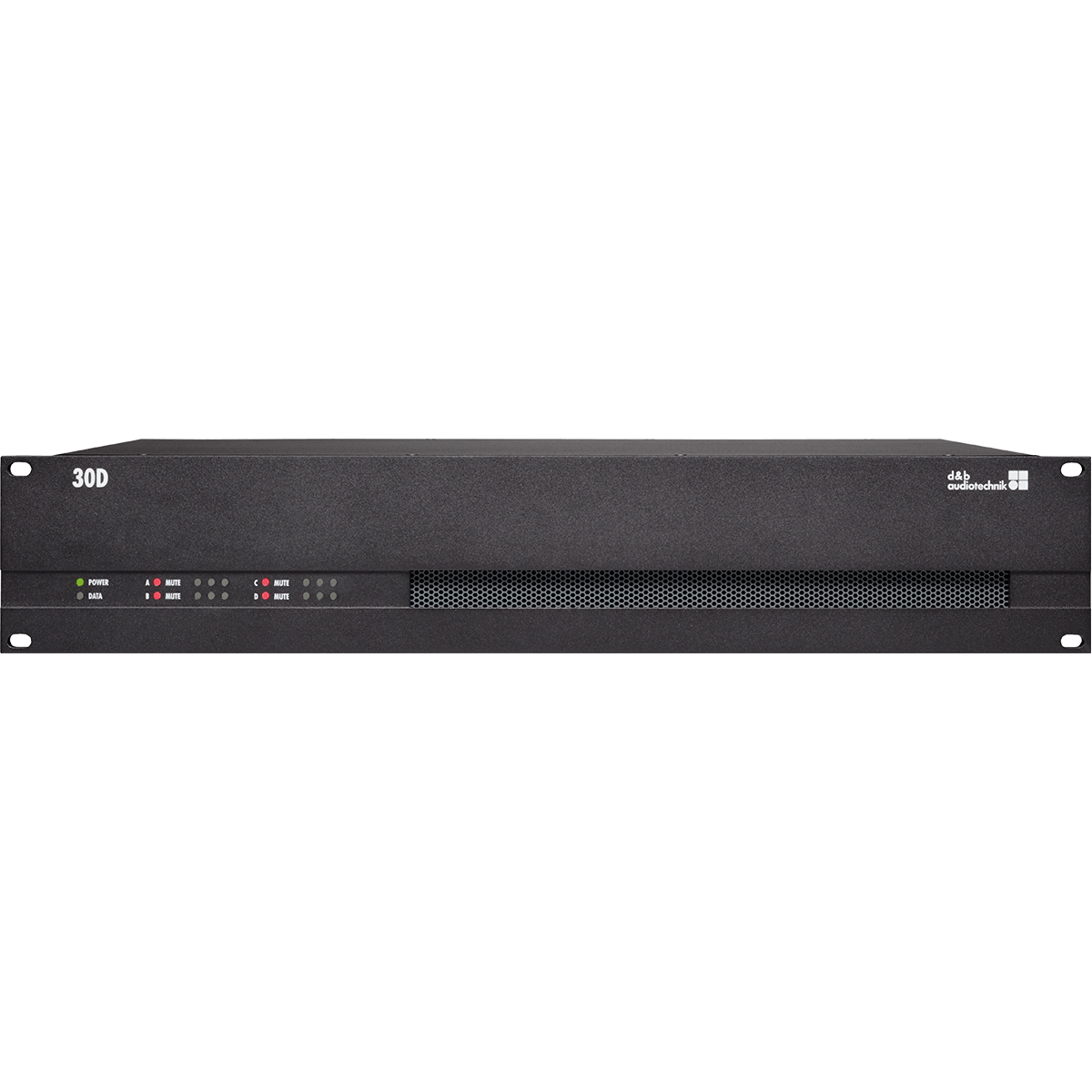 The 2 RU, four channel 30D amplifier is designed for permanent integration with applications that require medium to high Sound Pressure Level (SPL) capabilities. This device contains extended input management functionalities with separate Input Gain control for each input channel, General Purpose Inputs/Outputs (GPIO) and a General Fault connector. Enhanced system status monitoring functions such as Input and Load monitoring ensure suitability in an emergency situation. The 30D shares the same Digital Signal Processing platform as the latest generation of d&b amplifiers, providing configurations for all d&b loudspeakers as well as a linear mode. The DSP integrated within the 30D incorporates comprehensive loudspeaker management, switchable filtering functions as well as user definable equalization and delay capabilities. This includes two 16-band equalizers, providing optional parametric, asymmetric, shelving or notch filtering and up to 10 s (= 3440 m/11286 ft) signal delay, all of which can be applied independently to each channel. The 30D is accessible via the d&b Remote network, either via Ethernet using the Open Control Architecture protocol (OCA) or CAN-Bus using RJ45 connectors. The 30D is controlled using the integrated web interface, which enables access via a browser, or using the d&b R1 Remote control software. The device itself contains LEDs to display power, input, data and mute status. The LoadMatch function integrated within the 30D amplifier electrically compensates for the properties of loudspeaker cable used. The 30D incorporates Class D amplifiers utilizing a power supply with active Power Factor Correction (PFC) suitable for mains voltages 100 V/127 V, 50 – 60 Hz and 208 V/240 V, 50 - 60 Hz and maintains a stable output when used with weak or unstable mains supplies. Input and output connectors are all Euroblock sockets.