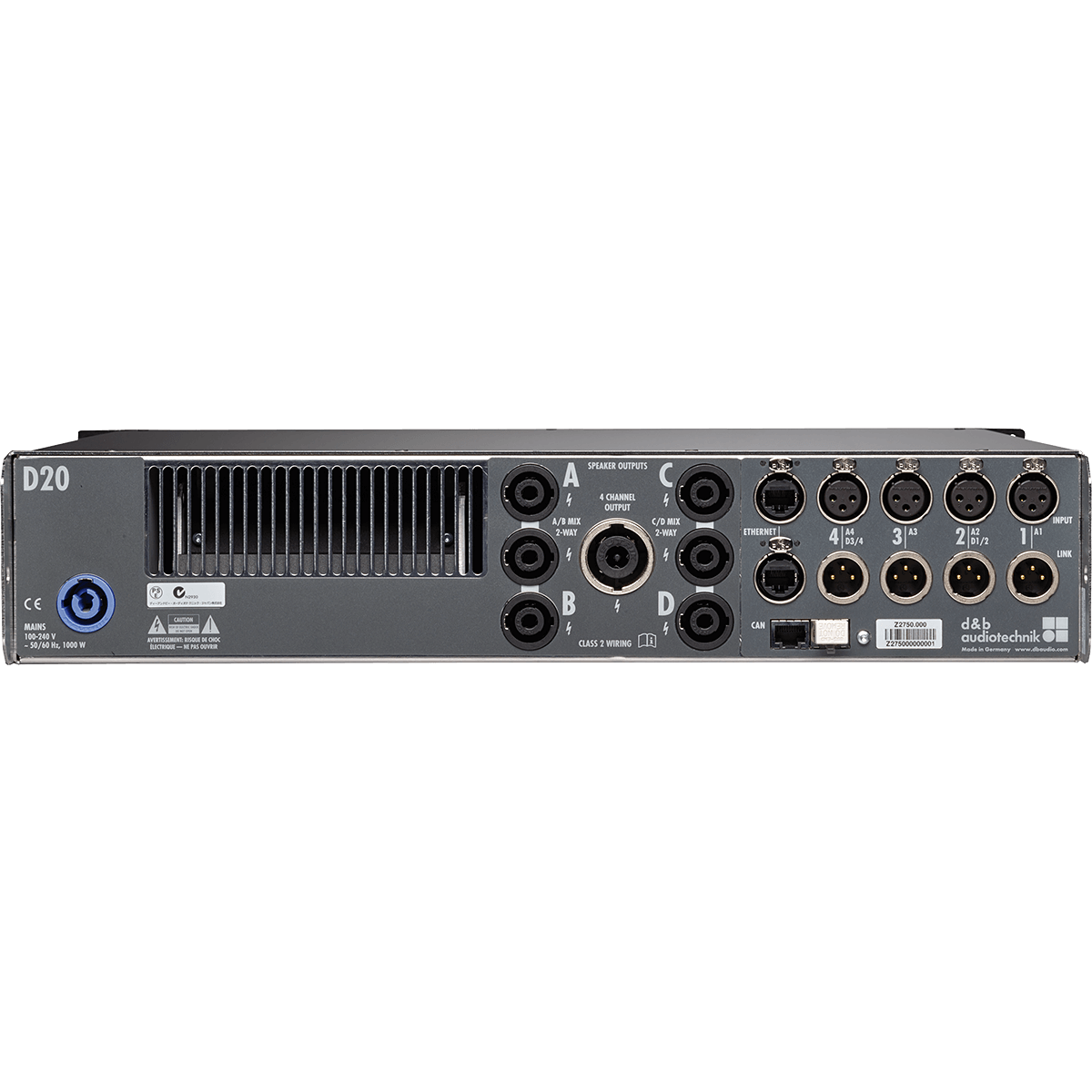 The 2 RU four channel D20 amplifier is ideally suited to mobile and installation applications which require low to medium Sound Pressure Level (SPL) capabilities. The D20 features the same Digital Signal Processing (DSP) platform as the latest generation of d&b amplifiers, containing configurations for all d&b loudspeakers except the J-Series and the M2 monitor, plus a linear mode. The signal delay capability enables user definable settings of up to 10 s (= 3440 m/11286 ft), which can be applied independently to each channel. The same applies to the two 16-band equalizers, providing optional parametric, asymmetric, shelving or notch filtering. The D20 incorporates a colour TFT touchscreen, offering quick access to the menu structure, while the rotary encoder can be used for fine adjustment. The front panel and the integrated touchscreen are tilted up for easy operation when the amplifier is below eye level. The equal ratio of signal input to amplifier output channels increases application flexibility particularly for monitor, frontfill or effect channel use. The LoadMatch function integrated within the D20 amplifier electrically compensates for the properties of loudspeaker cable used. The D20 incorporates Class D amplifiers utilizing a power supply with active Power Factor Correction (PFC) suitable for mains voltages 100 V - 240 V, 50 - 60 Hz and maintains a stable output when used with weak or unstable mains supplies. An NL8 provides all outputs on a single connector for loudspeaker multicores. Dual channel mode is driven through four individual NL4 connectors, while Mix TOP/SUB and 2-Way Active mode output configurations for applicable d&b loudspeakers are available via two central NL4 connectors. etherCON and RJ 45 connectors enable access to the d&b Remote network through OCA/AES70 via Ethernet and through CAN-Bus respectively.