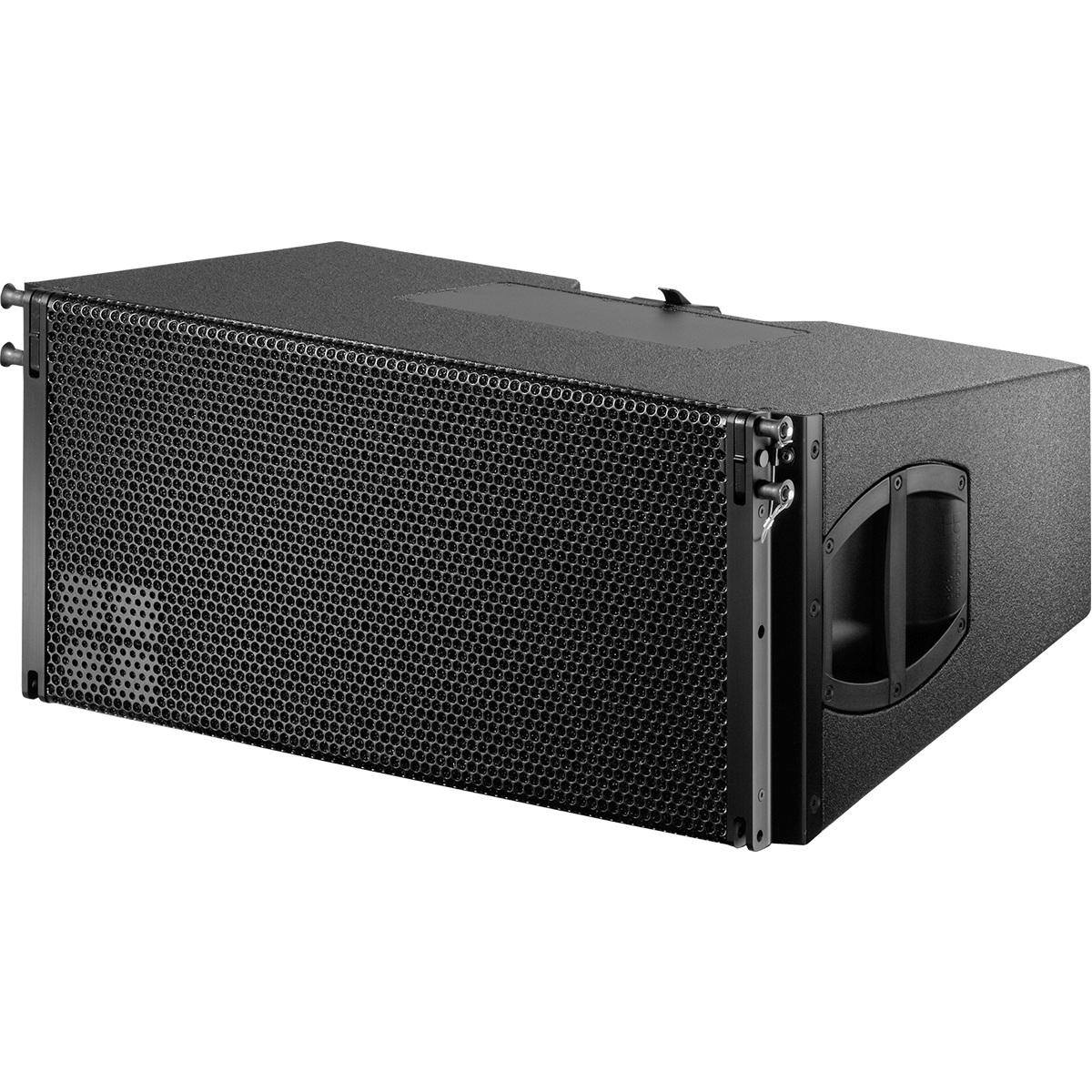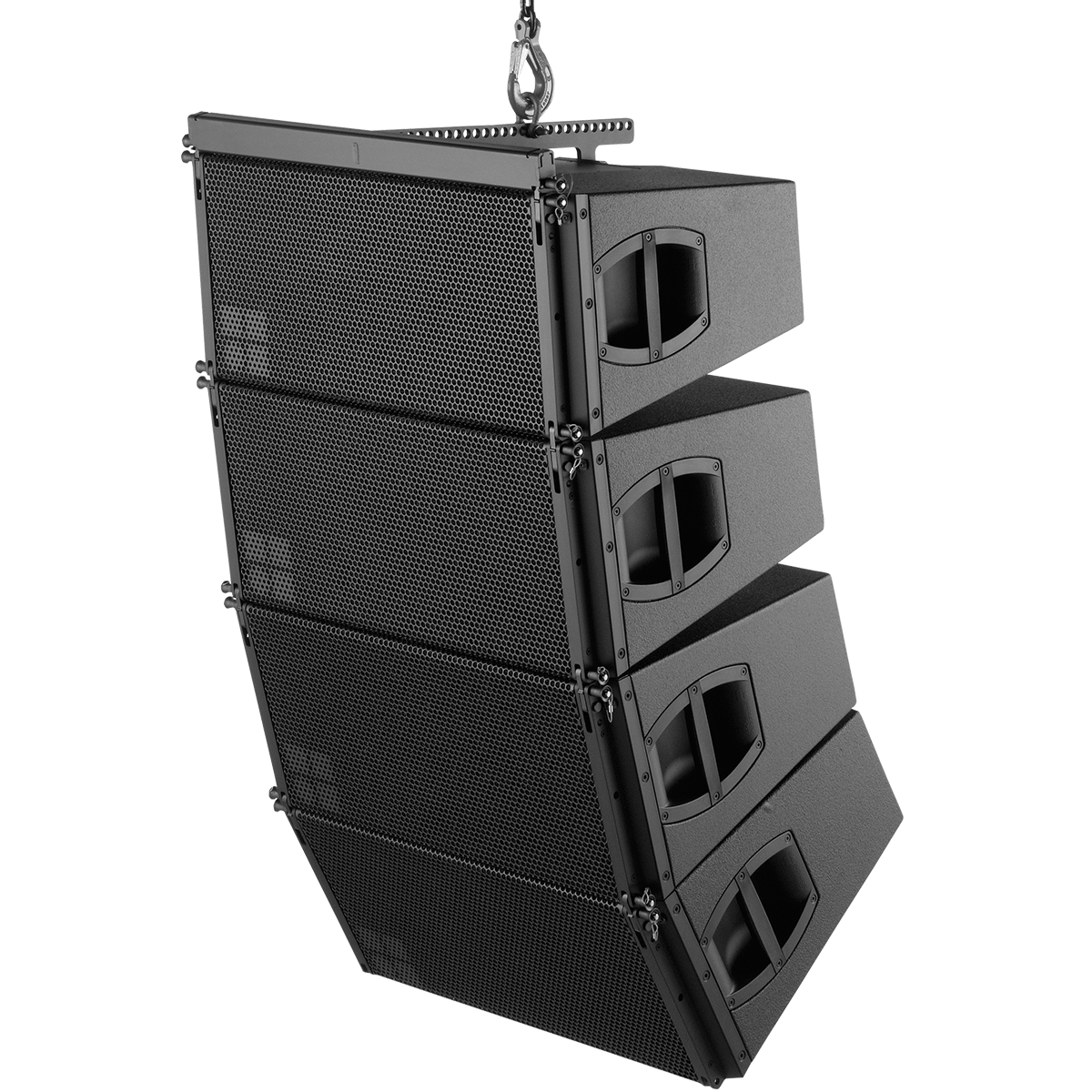 The V12 is a 3-way passive design housing 2 x 10" LF drivers, one hornloaded 8" MF driver and two 1.4" exit HF compression drivers with 2.5" voicecoils mounted to a dedicated waveshaping device. The symmetrical dipolar arrangement of the neodymium LF drivers around the centrally mounted coaxial MF and HF components allows a smooth overlap of the adjacent frequency bands in the crossover design. This results in an exceptional 120° horizontal constant directivity dispersion control nominally being maintained down to 250 Hz. The mechanical and acoustical design enables flown vertical arrays of up to twenty four loudspeakers. It can be used in columns of purely V12 loudspeakers or combined with V8s and / or with V-SUBs. The cabinet is constructed from marine plywood and has an impact and weather protected PCP (Polyurea Cabinet Protection) finish. The front of the loudspeaker cabinet is protected by a rigid metal grill backed by an acoustically transparent foam. Each side panel incorporates a handle, while two additional recessed grips are provided at the rear bottom of the cabinet.