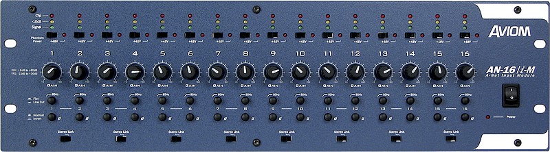 The AN-16/i-M is a 3U-high rack-mounted mic- and line-level input device with sixteen high-quality microphone preamps and 24-bit A-to-D converters. Each channel contains a three-segment level meter, a continuously variable gain knob, a phase reverse switch, 48-volt phantom power, and a rumble filter with an 85Hz rolloff. In addition, each pair of channels can be Stereo Linked for stereo operation in a Pro16® Monitor Mixing System.