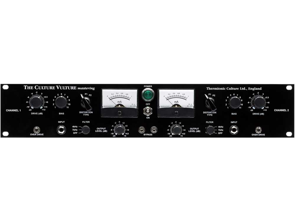 This is the latest in the Culture Vulture range and is designed to be used both as a mastering tool and for those applications where balanced inputs and outputs are required plus some extreme distortion. It has lower noise, better frequency response, and greater accuracy in level controls by having a 3 position input gain switch and a 2 position output attenuator. We use Mullard M8100 low noise high gain valves in the input stage, a pair of GE 5725s for Distortion effects, and the Philips 5963 in the output. All are military grade valves for long life. There is an extra exciting distortion setting on the Function switch. This is labelled P2. It’s similar to P1 (the most used, Pentode setting) but goes into mad distortion and compression when the valve is overloaded. The old P2 is now P3. In addition to the line level transformer balanced output, there is a lower level unbalanced output which can be used to go to inputs that require low level or if one wants to avoid the distortion in the output transformer.