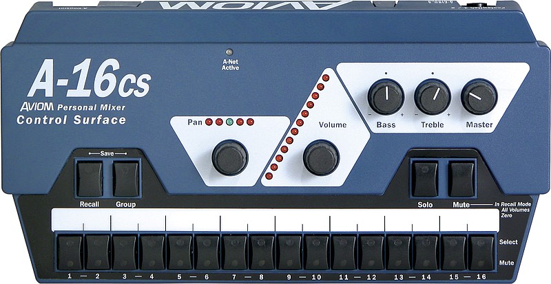 The user interface of the A-16CS is similar to that of the A-16II Personal Mixer, providing control over channel volume, grouping, pan, stereo spread, and master volume and tone. Up to 16 mix snapshots (stored in the A-16R) can be saved and recalled remotely from the A-16CS