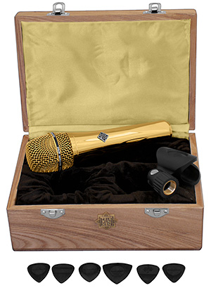 Each Special Limited Edition Gold M80 comes in a wooden box with special logo, a stand mount clip and a complete bonus set of TELEFUNKEN Guitar Picks made from graphite enriched Delrin.
